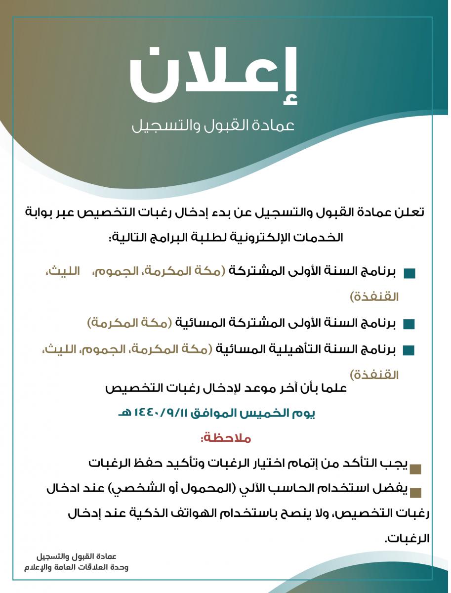 O Xrhsths عمادة القبول و التسجيل Sto Twitter إعلان عمادة القبول والتسجيل تعلن عن بدء إدخال رغبات التخصيص لطلبة السنة الأولى المشتركة Https T Co Epbadec1ox