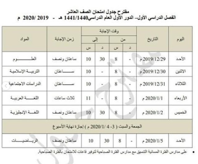 جدول امتحانات الصف العاشر الفصل الدراسي الاول الدور الاول 2019 2020 العلوم والتكنولوجيا